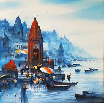 Ashif Hossain – His work in Acrylic Colors on canvas reveals the subtle nuances of the spiritual fervors and eternal religious sanctity associated with Benaras Ghats. His works are unique in their own way and have their visual aesthetics achieved through apt color combinations and their harmony as well as rhythm in proper perspectives of visual arts. The lucid and expressive works revealing cultural vignettes of Benaras, temples and shrines there and the overall religious environment prevalent in that area soon share a dialogue with the viewers due to their clarity and visual glory as well as aesthetics in the desired arena.