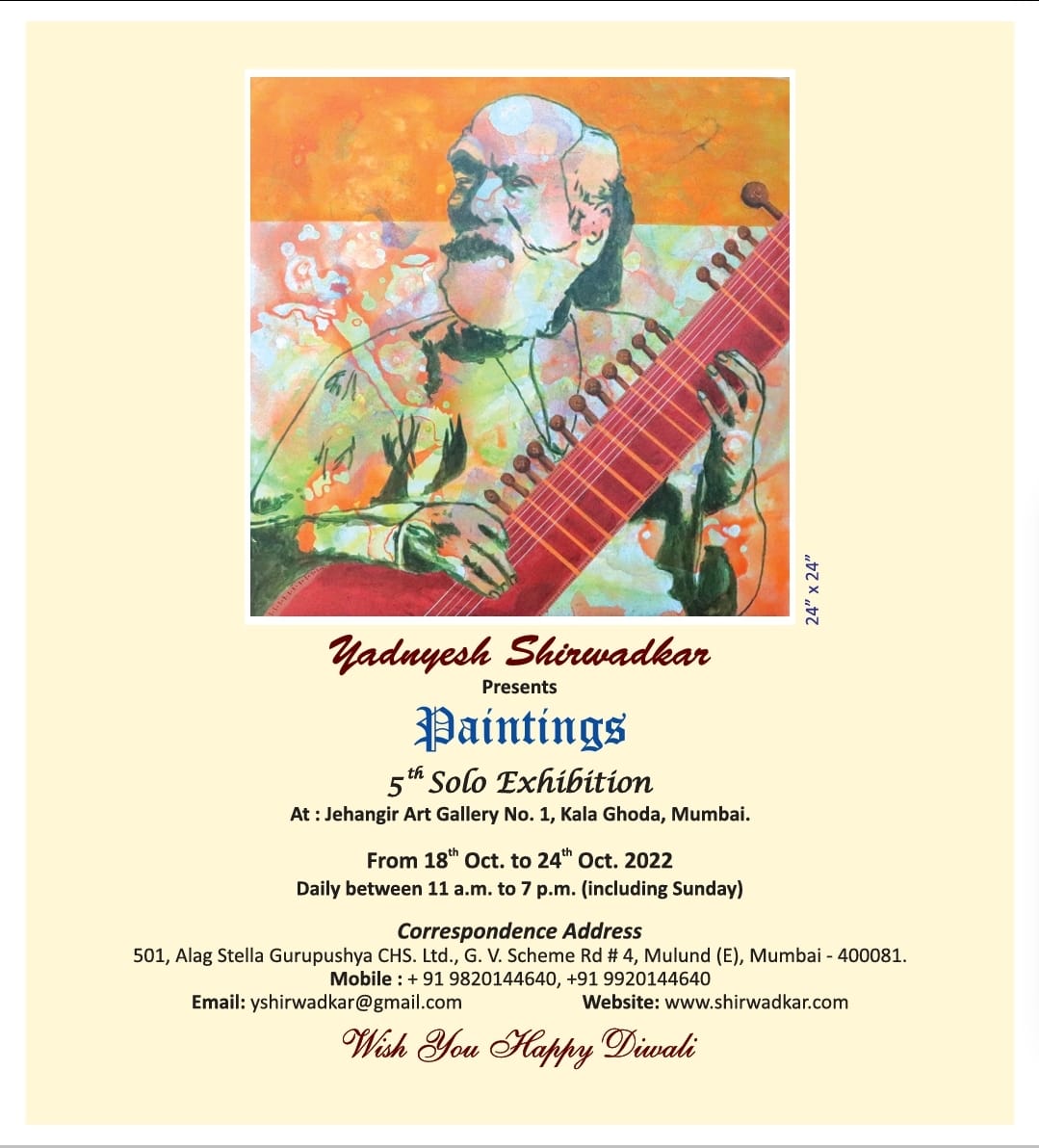 Recent work of a well known artist, Yadnyesh Shirwadkar is showing in a solo art show at Jehangir art gallery, M.G. Road, Kala Ghoda, Mumbai 400 001 from 18th to 24th October 2022 between 11 am. To 7 pm. This series in acrylic colours on Canvas exemplifies subtle nuances of the rhythm of music and its relevance / sanctity in life in order to enable a human being to enjoy the nectar and elixir of eternal divinity in apt perspectives of visual arts.