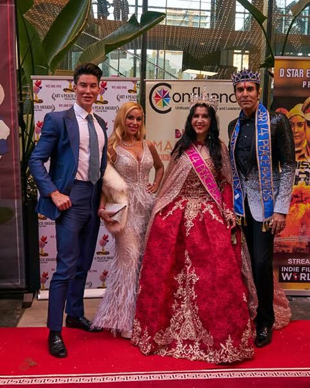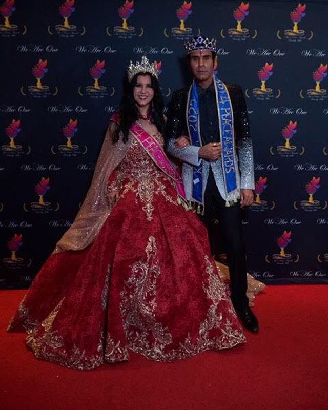 Dressed in white Shervani designed by Deepak Shah of More Mischief and styled ht Pooja Shah Bhandari and Jashank Bhandari, Sandip Soparrkar was crowned and honoured by Art4Peace Awards with the title of “King of Art4Peace” for his social work through “Dance for a Cause” and Ms Alma Dang an artist and a philanthropist from Mexico who has been working towards ending ignorance and exploitation of children was crowned “Queen of Art4Peace” at the prestigious Saban Theatre Beverly Hills, Los Angles, California, USA.