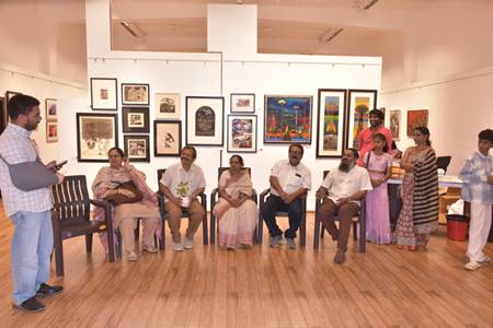 This show was inaugurated on 11th November 2025 by Honourable Guests Mr. Anant Nikam(Veteran print maker, artist and former HOD all department of Sir J.J. School of Arts), Mr. Gourmoni Das(Director & Founder of Nine Fish Gallery and Dot Line Space Foundation), Ms. Ranjitha S – Director & Founder of JMS Mani studio daughter of JMS Mani, Mr. Darshan Kumar YU – Curator(muesmuseologist), artist & Thinker, Sushma Sabnis – Art writer & curator among others.