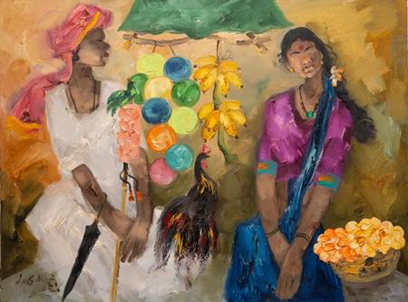 Rooted in a rigorous academic foundation, Mani’s early practice honed traditional disciplines of light, form and perspective, later blossoming into an intuitive painterly vocabulary that balanced realism, symbolism and emotional intensity. His celebrated Badami series remains central to Indian art discourse, elongated rural figures, dusky-skinned, rendered with sincerity and grace, their gestures carrying the poetry of daily labour and social memory. These works reaffirm Mani’s lifelong conviction that dignity lives in the ordinary and beauty in lived experience. Equally powerful are Mani’s landscape studies, from the atmospheric ruins of Hampi to abstracted chromatic vistas, where nature becomes metaphor for time, memory and the human spirit. His drawings, often executed in charcoal, reveal a master draftsman able to distill emotion through line alone, capturing movement, fragility and stillness in equal measure. Throughout his evolving practice, Mani cultivated his studio as a sanctuary of creativity and learning, a space meticulously organised yet spirited, where students, artists and grandchildren entered freely. As a devoted teacher and principal at Ken School of Art, he encouraged experimentation, peer support and the courage to think beyond conventions. His belief in nurturing the next generation remains one of his greatest contributions to Indian art.